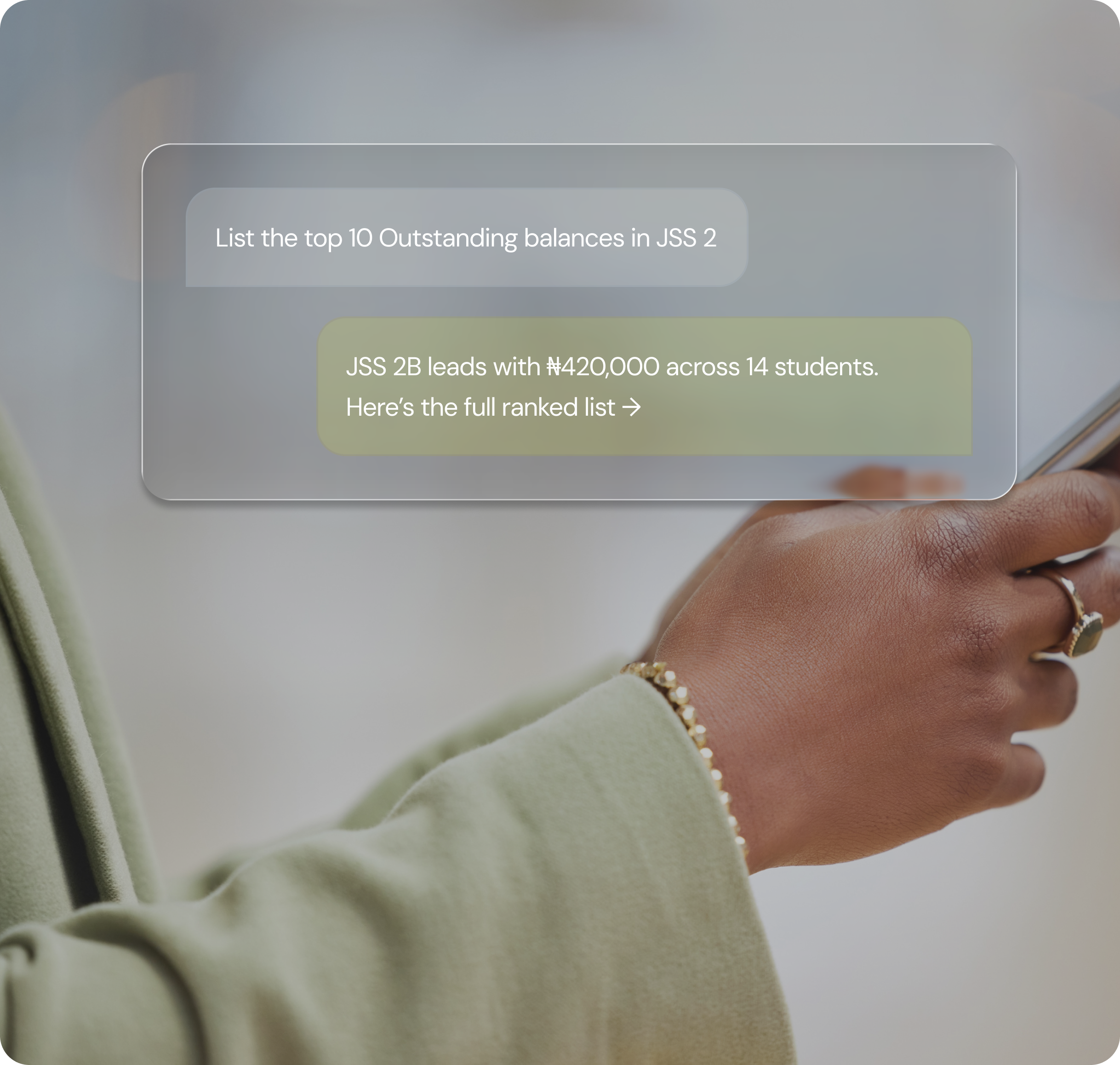 "How much does JSS2 owe?" "Who hasn't paid this term?" "Show me last month's payroll." Ask in English, Yoruba, Hausa, or Igbo — via WhatsApp or the dashboard. FundTrak AI pulls live data and answers instantly, scoped to your role.